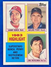 1. Topps didn’t know what “Highlight” means. The Cincinnati Reds were terrible in the early 1980s and, by the time I started following them in 1983, Johnny Bench was about the only interesting thing they had going (aside from Mario Soto). His retirement was no highlight in my book, and I suspect the same held true for Yaz and Boston Red Sox fans. And Perry’s retirement must have dinged Vaseline’s standing in the stock market.