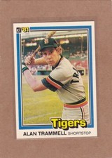The design and card quality of 1981 Fleer are generally better than those of 1981 Donruss, too, and Trammell’s home white Tigers jersey looks pretty snazzy against the dark background.