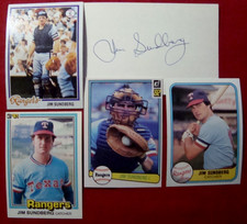JIM SUNDBERG SIGNED INDEX CARD AUTOGRAPH & 4 BASEBALL CARDS - TEXAS RANGERS